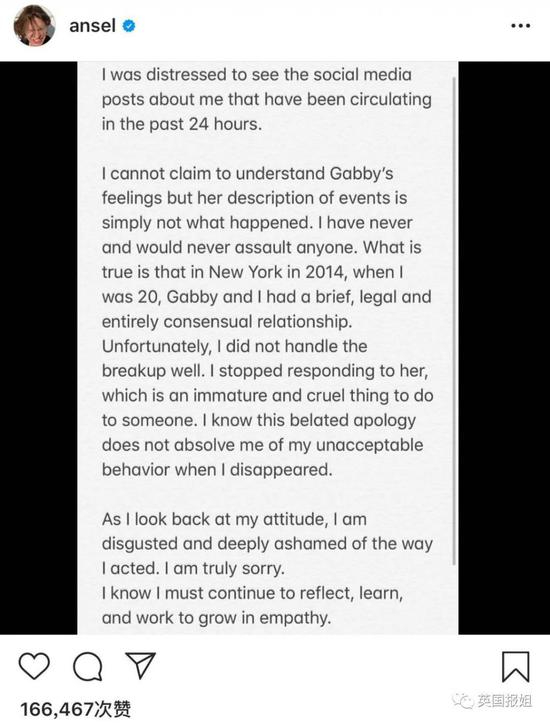 而对于性侵指控,Ansel Elgort 于今天做出了回应。他发布声明表示,自己当时和 Gabby 处于一段短暂恋情之中,关系合法且双方自愿,不过他没有处理好分手问题,直接不理会 Gabby,现在他觉得这种方式很不成熟也很无情,对此感到抱歉。
