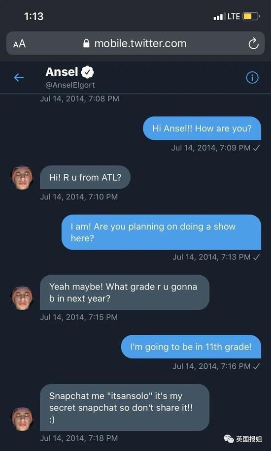 Gabby 也给出了当时的截图以证明自己所言非虚,途中的她给 Ansel Elgort 发了一句 “ 我真的超级爱你,明天就是我的生日了,但你可能都不会注意到我吧 ”,截图显示名为 Ansel Elgort 的账号回复了两段话: