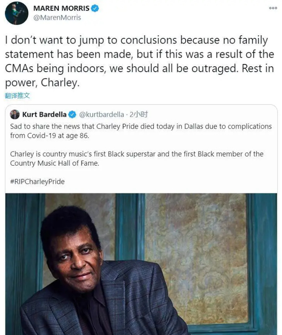 著名乡村音乐歌手、同样参加了今年“乡村音乐奖”颁奖的梅伦·莫里斯就表示:“因为还没有(查理·普莱德)家族的公开声明,所以我不想提前做出结论,但如果他是因为出席乡村音乐奖而感染了病毒,那么我们所有人都应该对此感到愤怒。”