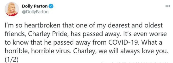 获悉查理·普莱德去世的消息后,美国天后级的歌手多利·芭顿悼念称:“我最亲爱的老朋友查理·普莱德去世了,我的心都要碎了,当得知他是因新冠病毒而去世的,这种感觉更糟糕了。这是一种多么可怕的病毒啊,查理,我们将永远爱你。”