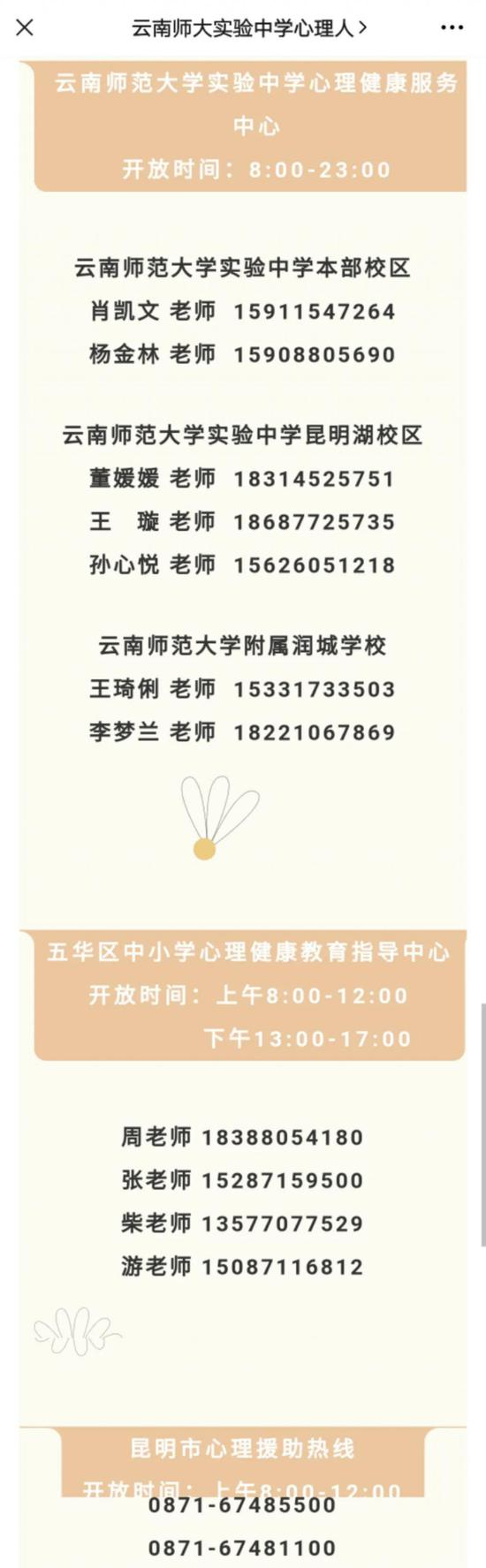 上述段姓教师表示,学校公众号已经发布相关信息,公布心理咨询热线服务的号码。新京报记者发现,一个名为 “ 云南师大实验中学心理人 ” 的微信公众号于 23 日发布《云南师范大学实验中学心理咨询热线服务通知》,公布了心理咨询热线的号码。