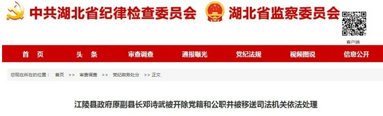 1、江陵县政府原副县长邓诗武被开除党籍和公职并被移送司法机关依法处理