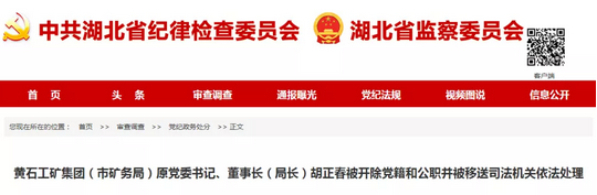 2、黄石工矿集团(市矿务局)原党委书记、董事长(局长)胡正春被开除党籍和公职并被移送司法机关依法处理