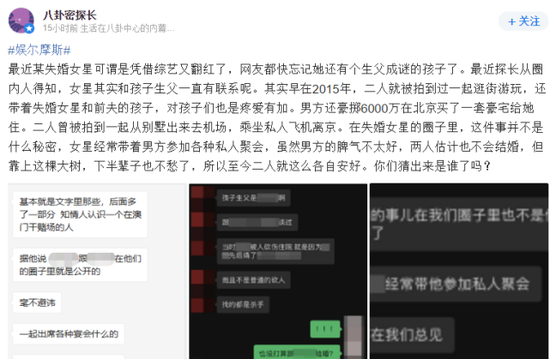 4月14日,有大V发文爆料最近因为综艺成功翻红的失婚女星,三胎的秘密终于公开了,原来查不到的生父竟然一直在私下联系,两人甚至早在15年就被拍到一起约会,男方是某神秘富商甚至给张柏芝花6千万别墅给她养胎。