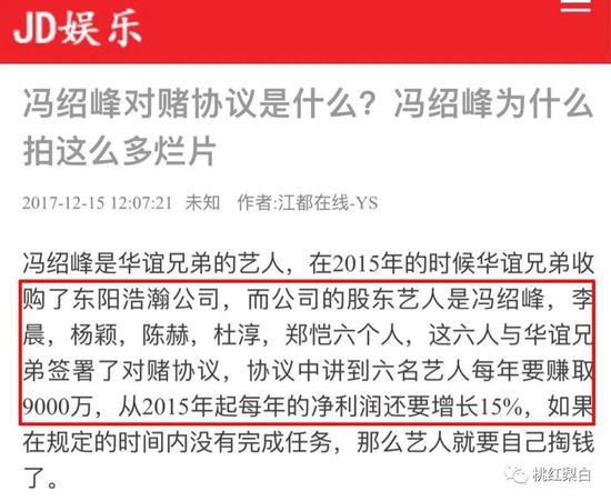 除了 2015 年那会儿,华谊兄弟收购东阳浩瀚娱乐公司,冯绍峰和李晨、陈赫他们几个都入股了,和华谊签了对赌协议,每年要赚到 9000 万。