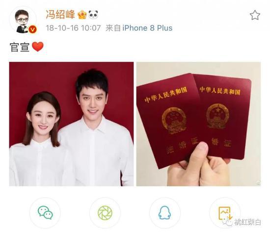 当时,赵丽颖和冯绍峰几乎同时发博,晒出了结婚证和合影,配文非常简单,只有 “ 官宣 ” 俩字。