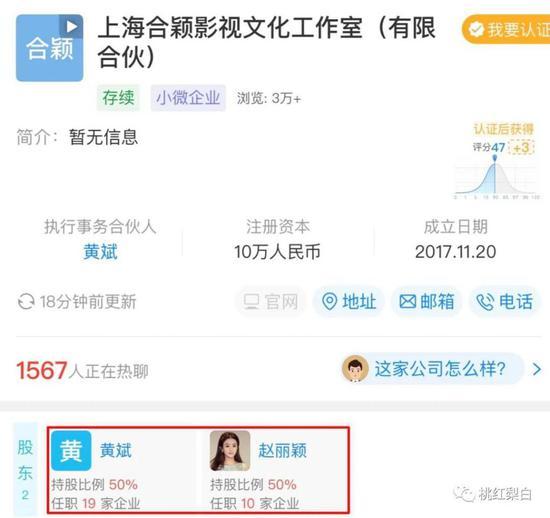 2017 年 11 月,上海合颖影视文化工作室成立,法人代表黄斌,与赵丽颖各自持股 50%。