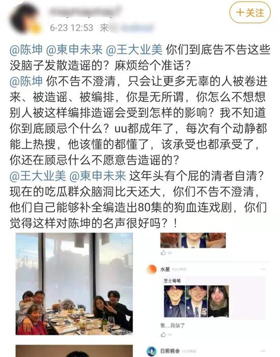 实际上,事件真相不明,大家也都只是猜测,但这样的猜测却引起了陈坤粉丝的不满,发文艾特陈坤以及公司,要求他们澄清这件事,并起诉那些造谣的人。