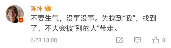 不仅不打算澄清这件事,陈坤还反过来安慰粉丝:“不要生气,没事没事。先找到‘我’,找到了,不大会被‘别的人’带走”。