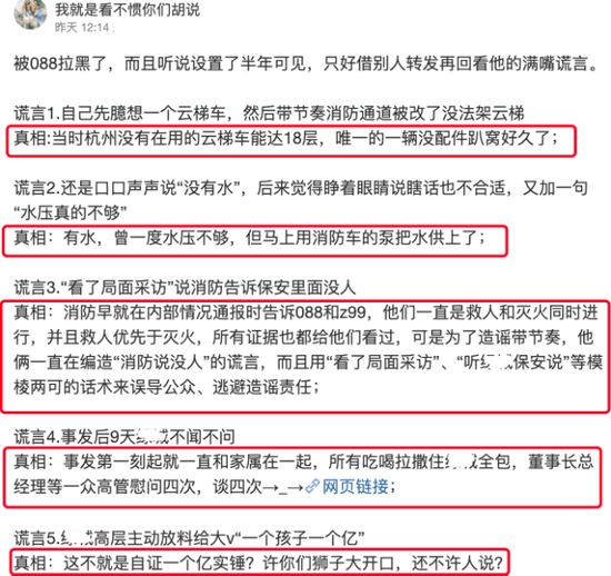 7月15日,网友根据林生斌当年的这些控诉揭露了5个谎言真相,骂其满嘴谎言。网友透露,事情的真相是当时杭州没有在用的云梯车能到达18层,与物业的草坪无关。