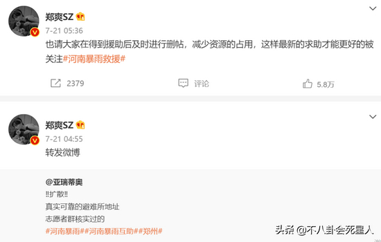又恰逢河南灾情,郑爽连夜转发暴雨求助微博,想挽回一些好感,结果也就持续了一个晚上,之后又没消息了。