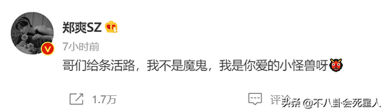 等到灾情和奥运会的热度过去了,她又在凌晨突然发博:哥们给条活路,我不是魔鬼,我是你爱的小怪兽呀。许多网友都一头雾水,郑爽这是在求饶?