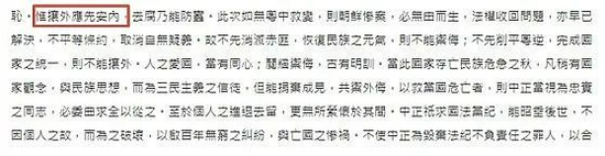 《中华民国史事日志》1931年7月12日如此记录。蒋介石在1931年7月23日《告全国同胞一致安内攘外》中宣称:“攘外应先安内,去腐乃能防蠹……故不先消灭赤匪,恢复民族之元气,则不能御侮;不先削平粤逆,完成国家之统一,则不能攘外。”(见《先总统蒋公思想言论总集》30卷150页)