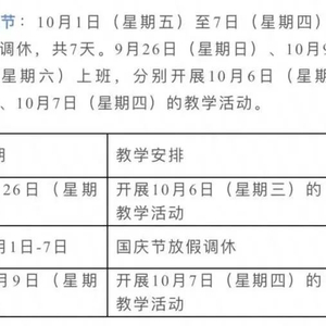 10月1日至7日放假调休,共7天;9月26日(星期日)、10月9日(星期六)开展教学活动。