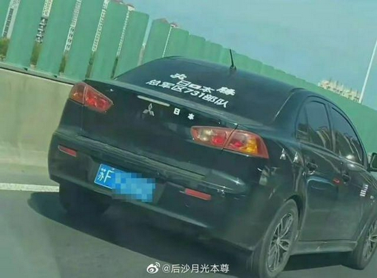 9月27日,有网友举报江苏南通一黑色轿车上贴有“必胜、日本、总军区731部队”等字样。
