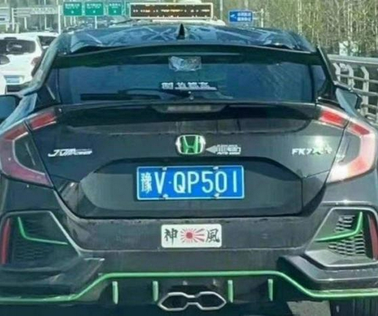 从视频中可以看到,涉案车辆的后方贴着日本国旗、日本军旗、“支那制造”和“武运长久”的贴纸。公安民警发现后,第一时间对其进行传唤。
