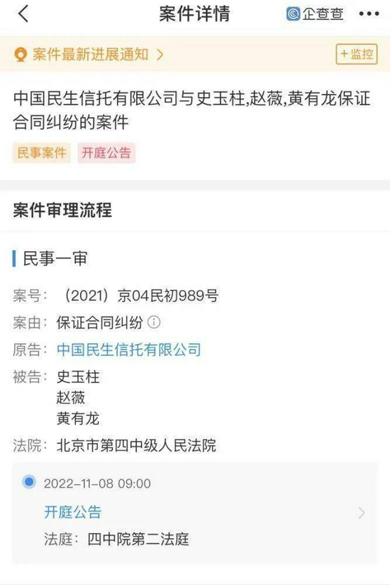 近日,中国民生信托有限公司将赵薇及其丈夫黄有龙、巨人网络集团董事长史玉柱三人告上法庭。10月9日新增的开庭公告显示,此案案由为保证合同纠纷,将于2021年11月8日在北京市第四中级人民法院开庭。