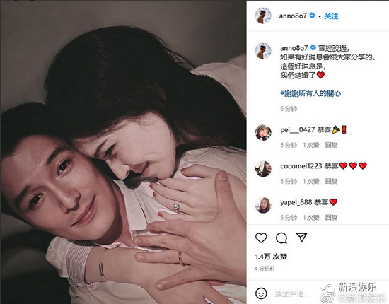 两人在社交平台上晒出合影,配文:曾经说过,如果有好消息会跟大家分享的。这个好消息是,我们结婚了
