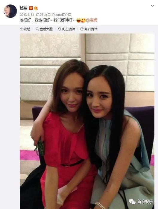 讲远一点,当时唐嫣最好的朋友还是杨幂,杨幂当年点赞了一条吐槽邱泽的微博,算是间接为好闺蜜撑腰,以及在大家担心唐嫣受情伤状态不好的时候,杨幂发微博说:她很好,我也很好~我们都特好~