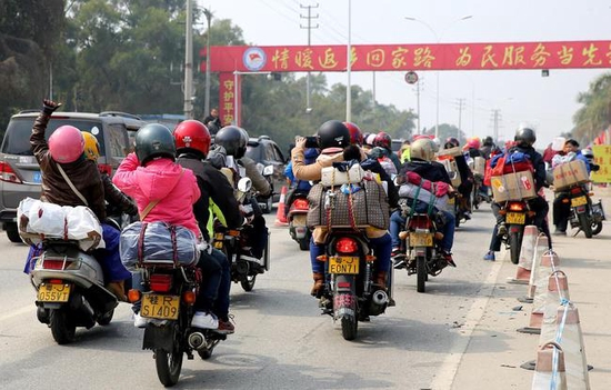 广西历来是劳务输出大省,每年赴粤务工人员达700万。从珠三角骑行回广西,多数可在一天内到达。因此,在“摩托大军”中,又以广西籍的务工人员最多。