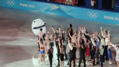 冰墩墩也穿着滑冰鞋在最后时刻赶来。出场没多久就颜面尽失……