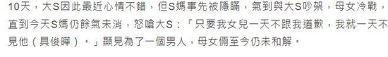 据台媒指,S 妈由于大 S 把再婚一事先斩后奏仍然在生气当中,并且还放出狠话,怒呛女儿:" 只要她一天不跟我道歉,我就一天不见他(具俊晔)。"