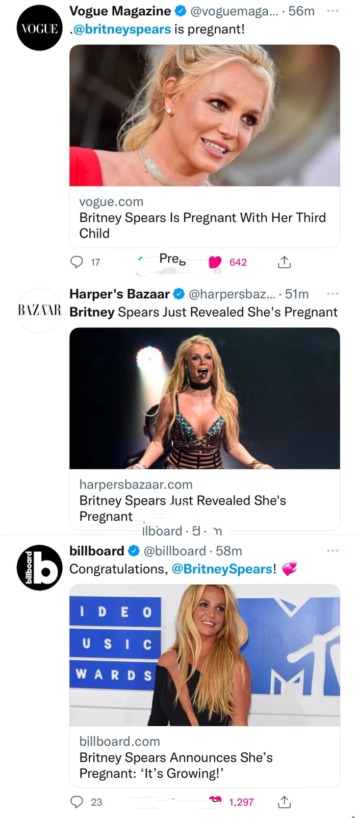 随着怀孕的消息被官宣,话题“BRITNEY”和“布兰妮怀孕”瞬间登上了外网热搜,多家知名媒体相继报道此事,布兰妮的关注度和影响力太大了!