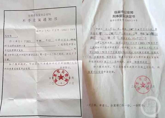 举报人提供的相关资料显示,2021年8月6日,甘肃省临夏市公安局作出《不予立案通知书》称,经审查认为无犯罪事实发生,决定不予立案。举报人家属告诉上游新闻记者,此后他们开始了维权。一个月后的2021年9月3日,临夏市公安局作出《刑事复议决定书》认为,此前的《不予立案通知书》认定的事实清楚、证据充分、依据准确、程序合法,决定维持原决定。