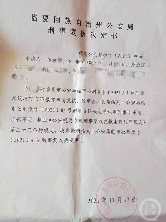 2021年11月17日,临夏回族自治州公安局作出的《刑事复核决定书》显示,经审查,认为临夏市公安局的《刑事复议决定书》认定事实不清、证据不足,决定撤销。