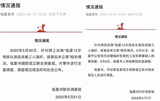 2022年5月31日12时,中共临夏州委网络安全和信息化委员会办公室微信公众号“临夏发布”对该案做了第一次情况通报。通报称,5月30日,针对网上反映“临夏12岁残疾女孩自述被三人强奸,报案后未立案”相关情况,临夏州已经成立联合调查组,对事件进行全面调查,调查情况将及时向社会公布。