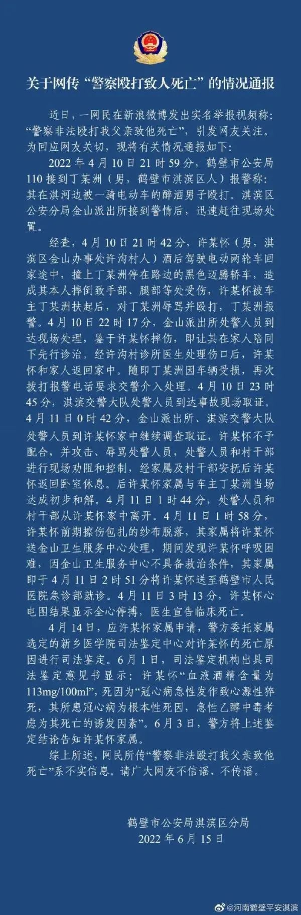 近日,一河南网民在新浪微博发出实名举报视频称:“警察非法殴打我父亲致他死亡”,引发网友关注。后鹤壁市公安局淇滨分局发布情况通报,还原实情如下: