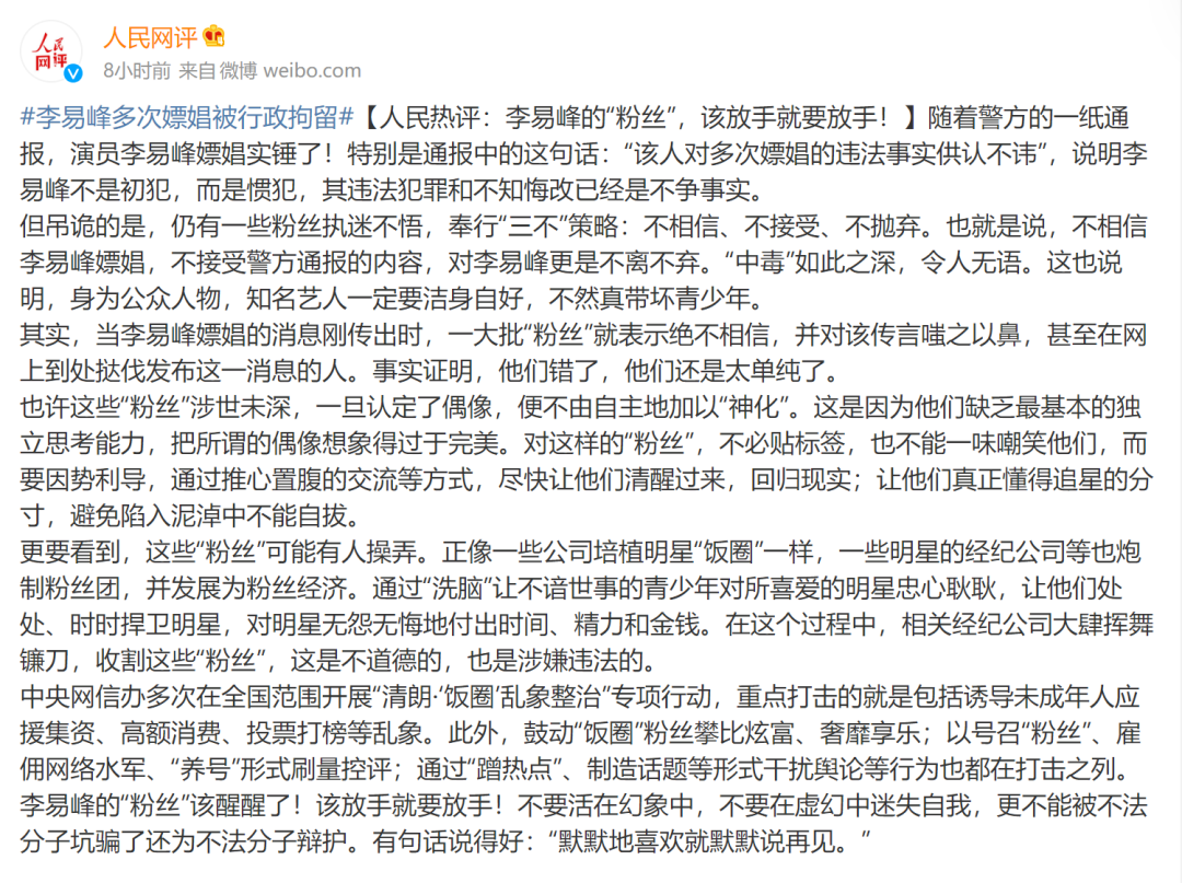 人民网评:李易峰的“粉丝”,该放手就要放手!