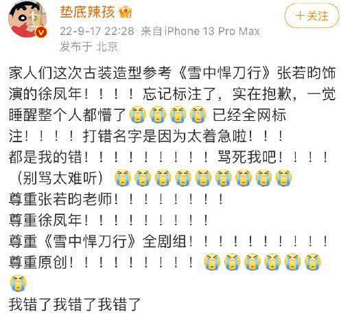 17 日晚,网红垫底辣孩针对最新发布的一组图片,造型被指疑似抄袭古装剧《雪中悍刀行》中张若昀饰演的徐凤年作出回应,他称自己忘记标注了,打错名字是因为太着急了,并强调尊重原创。此前,原摄影师曾在垫底辣孩的评论区下方留言了一个 “ 弱 ” 的手势。