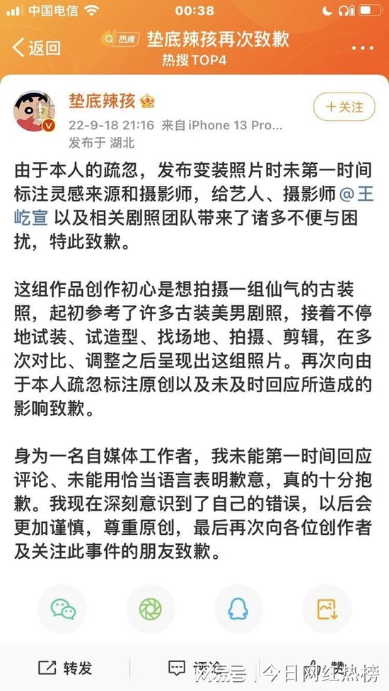 关注9月18日晚,垫底辣孩再发文道歉:“由于本人的疏忽,发布变装照片时未第一时间标注灵感来源和摄影师,给艺人、摄影师@王屹宣 以及相关剧照团队带来了诸多不便与困扰,特此致歉。”他还表示:“我现在深刻意识到了自己的错误,以后会更加谨慎,尊重原创。”