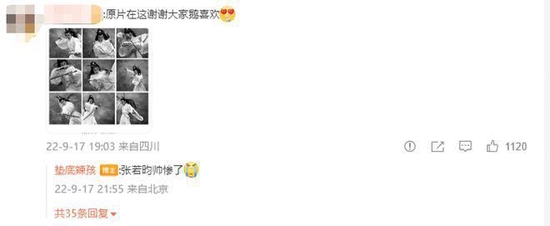 垫底辣孩还在评论区回复网友的留言,并称赞原片 “ 张若昀帅惨了 ”。