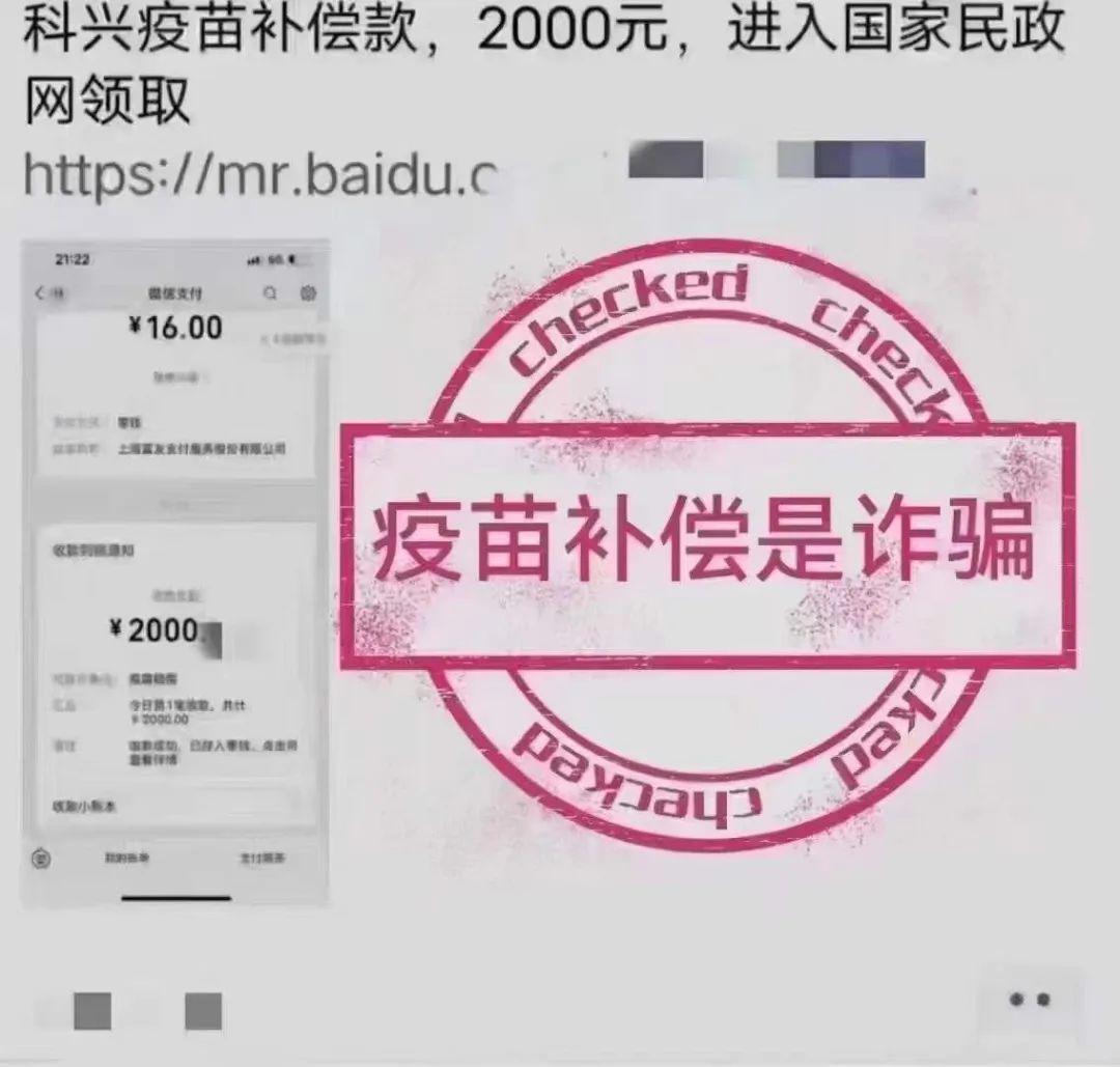 近日,多地警方提醒:科兴疫苗补偿2000元,是新型诈骗手法,不要理会,不要点击!提醒身边的亲戚朋友们,凡事要银行卡号、输入验证码、活动返利的,就是诈骗!