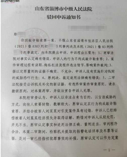 涉案驳回申诉通知书显示淄博市中级人民法院经审查认为,申诉人以非法占有为目的,以言语威胁的方式,向他人索要财物,数额较大,原审认定其行为构成敲诈勒索罪,并结合被害人刘某某对引发案件具有过错,申诉人已经赔偿被害人刘某某经济损失并取得谅解,酌情对申诉人从轻处罚,并无不当。