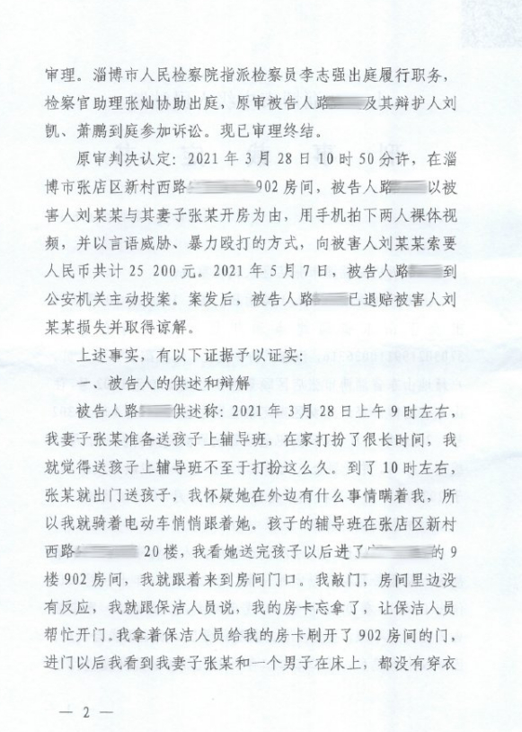 妻子张某在孩子上辅导班时与另一名男子刘某某在酒店偷情,31岁的山东淄博人路某某跟踪后在酒店房间内撞破这一场景,并收取了刘某某2万多元补偿金。后路某某被控敲诈勒索罪,一审被判处有期徒刑6个月。出狱后,路某某始终认为自己无罪,并一直在坚持上诉和申诉。