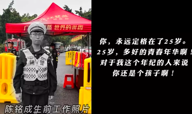 近日,佛山市南海分局交警大队的辅警陈铭成,在与民警在龙高路处置交通事故期间,被一辆疾驰而至的小车撞伤,经送医抢救无效牺牲,年仅25岁。而事发前一天晚上,陈铭成还为刚刚去世的祖母守灵,熬了一个通宵。
