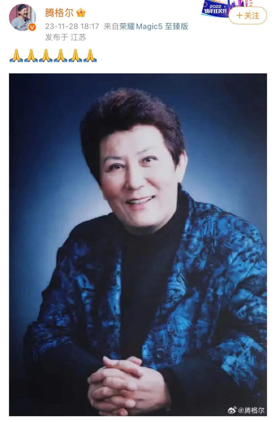 关注11月28日,音乐人科钦夫发文:“惊闻德德玛老师病逝。现在,我父亲阿拉腾奥勒、德老师、火华老师,《美丽的草原我的家》的三位缔造者可以在天上重聚了。”科钦夫告诉记者,他向德德玛的家人证实,德德玛于28日午后因病去世,享年76岁。