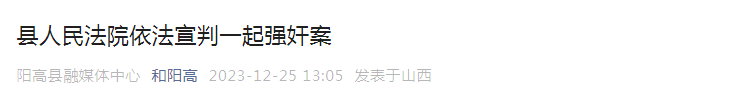 据报道,12月25日,大同市阳高县人民法院依法公开宣判一起强奸案,被告人席某某因犯强奸罪,一审被判处有期徒刑三年。