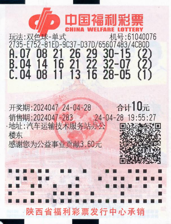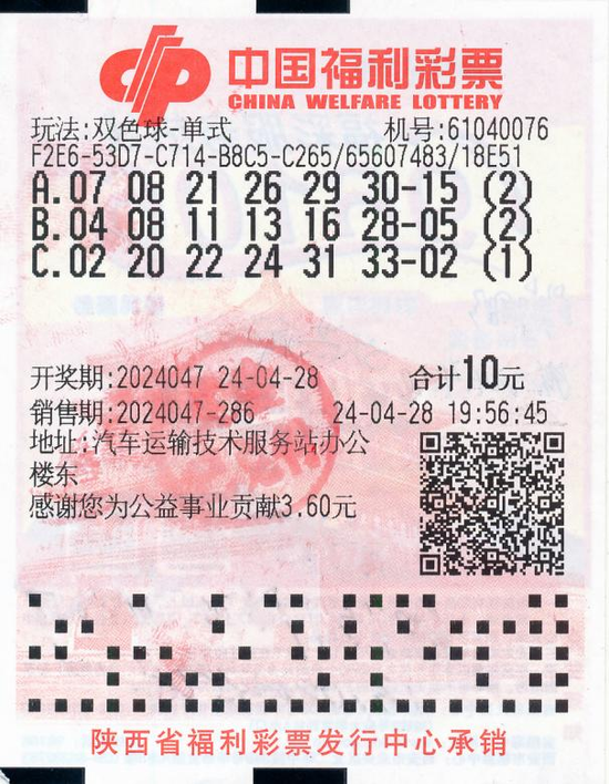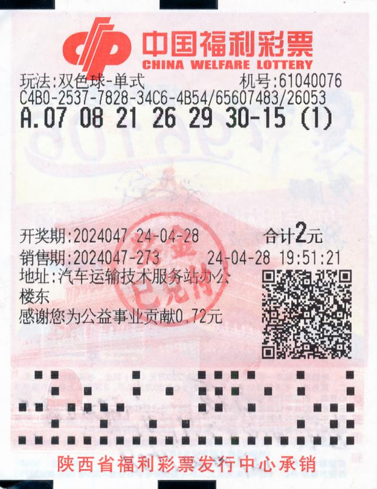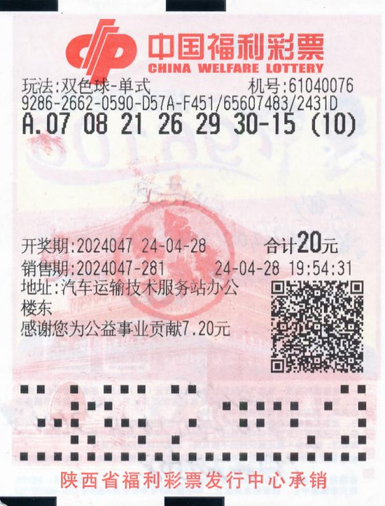 4月28日,福彩双色球游戏第2024047期开奖,开出红色球号码07、08、21、26、29、30,蓝色球号码15;当期中出一等奖26注,单注奖金592.0995万元,全部出在陕西,其中咸阳市中出25注,西安市中出1注。