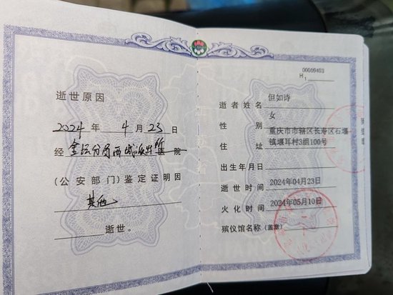 5月9日,家人收到一份盖有“常州市公安局金坛分局西城派出所”印章的“非正常死亡证明”显示,但如诗于2024年4月23日,在金坛区薛埠镇青龙梗南侧山林内、金坛区通济河桥内死亡,现已查明死因。