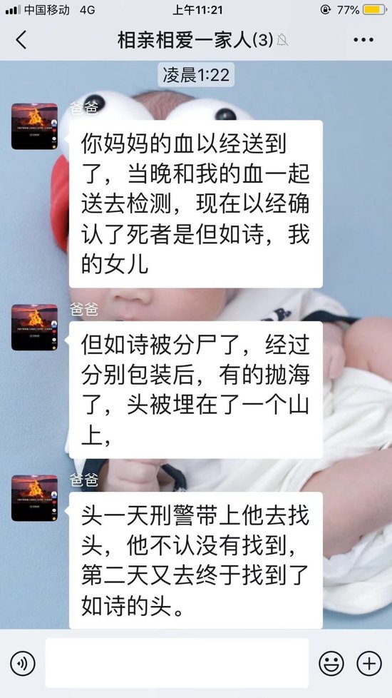 二妹遇害后,但丽与父亲、幺妹3个人建了一个微信群,但丽的父亲在群中写道:“你妈妈的血以经(已经)送到了,当晚和我的血一起送去检测,现在以经(已经)确认了死者是但如诗,我的女儿。”“凶手是在2月28日与如诗去取钱时被摄像头录下,他抢走了如诗卡里的全部钱,之后如诗无应答,我报警后警方经过长时间、大量排查后锁定了他,最后凶手也承认了。”“但如诗是在3月18号被凶手卡脖子杀害的,后又分尸。”