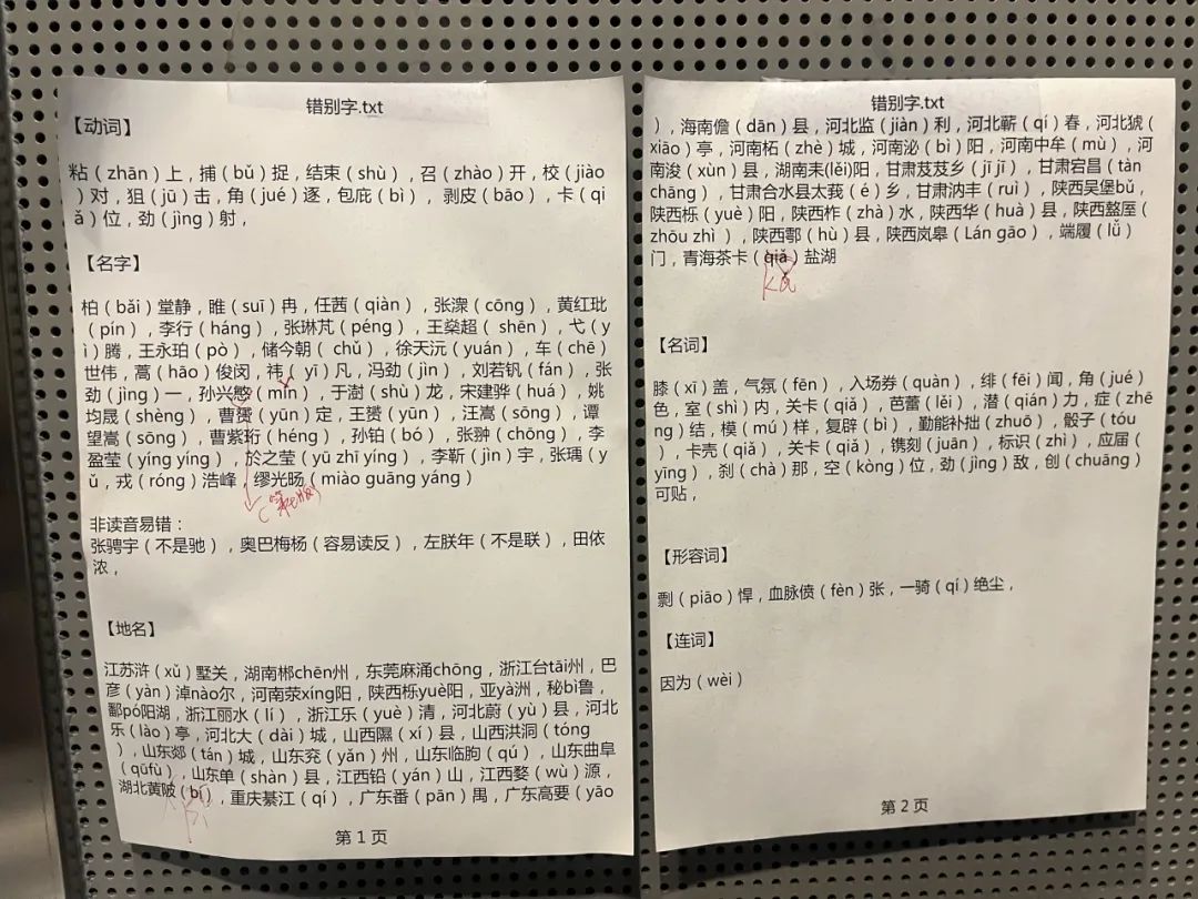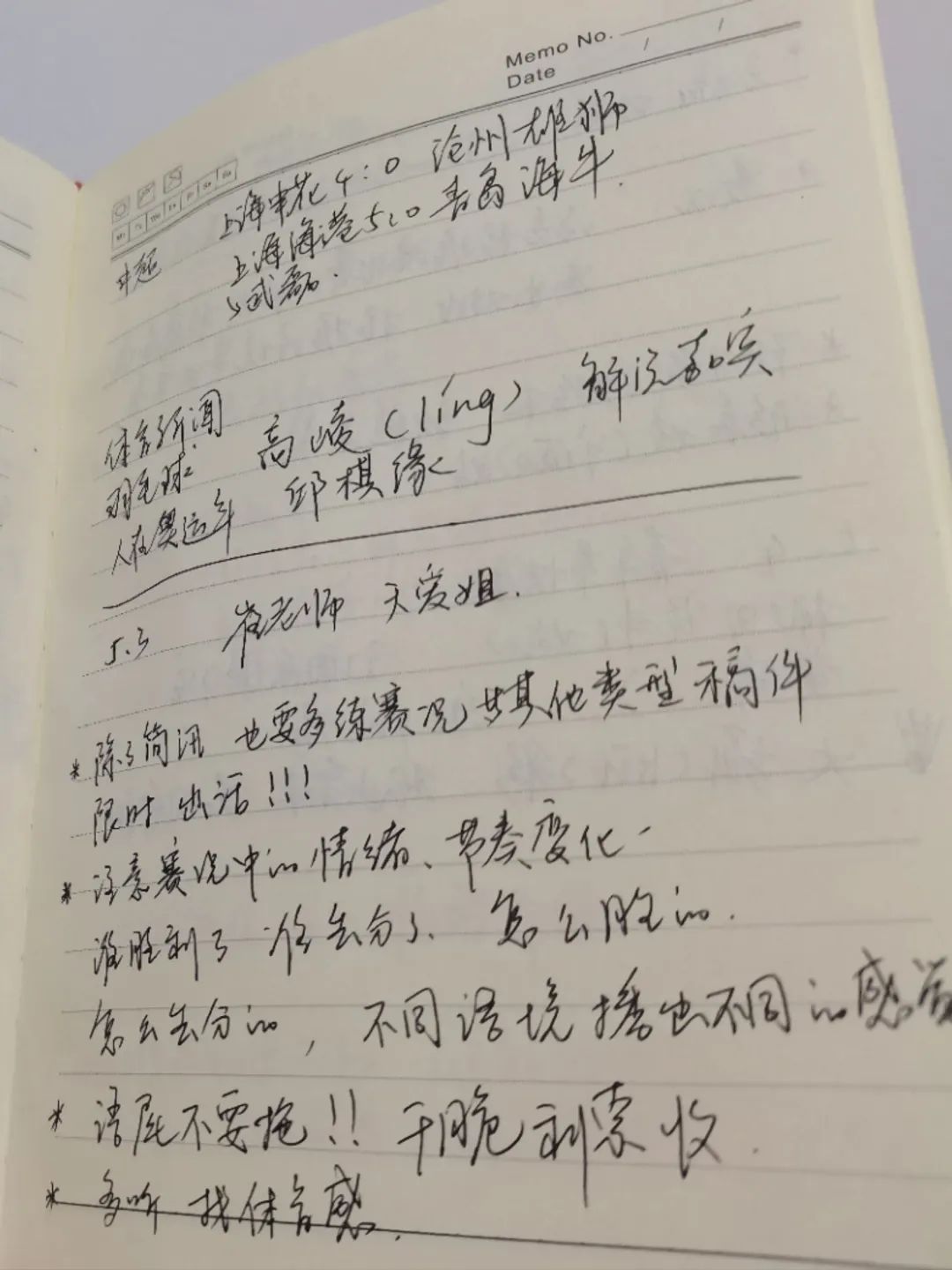 更多的工作安排也在“提质增效”中。播报排班从一组一天升级到一组两天、三天,未来可能还会延长至一周,强化播报记忆和状态,其间还要穿插配音班,以便提前适应大赛期间身兼数职的工作节奏。栏目组还考虑,让他们接触一些后期剪辑、出镜采访等业务,掌握体育播报的方方面面。此外,用体育知识来充实头脑,也是同学们的每日必学(附笔记一页)。