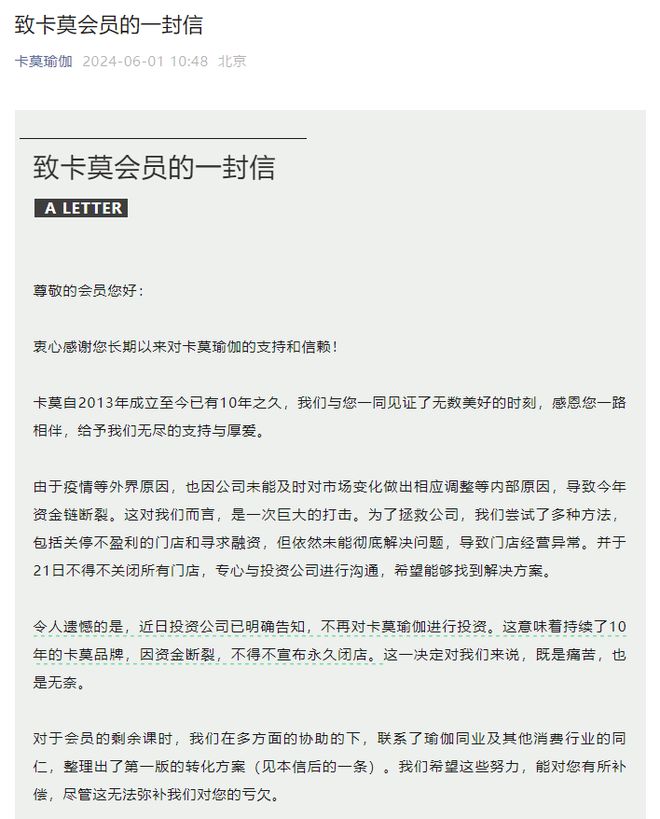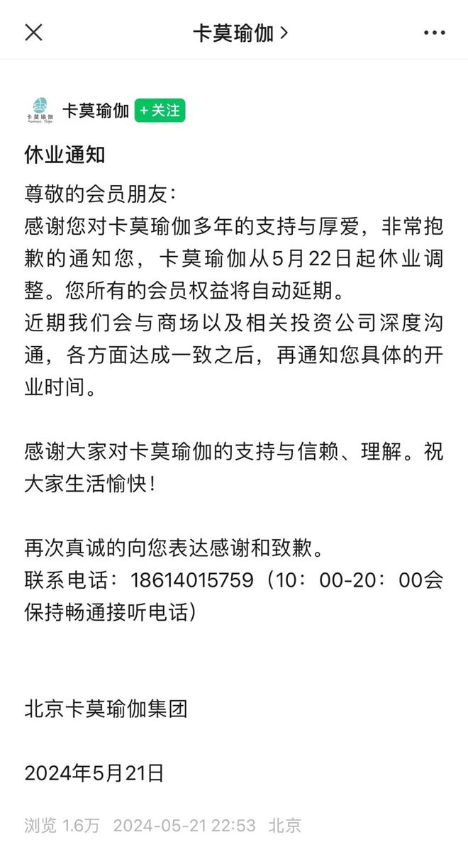 6月1日,知名连锁瑜伽品牌卡莫瑜伽发布公告称正式永久关闭所有门店。