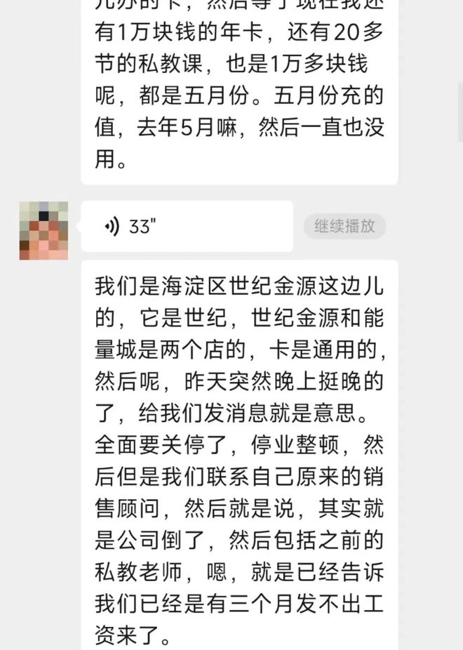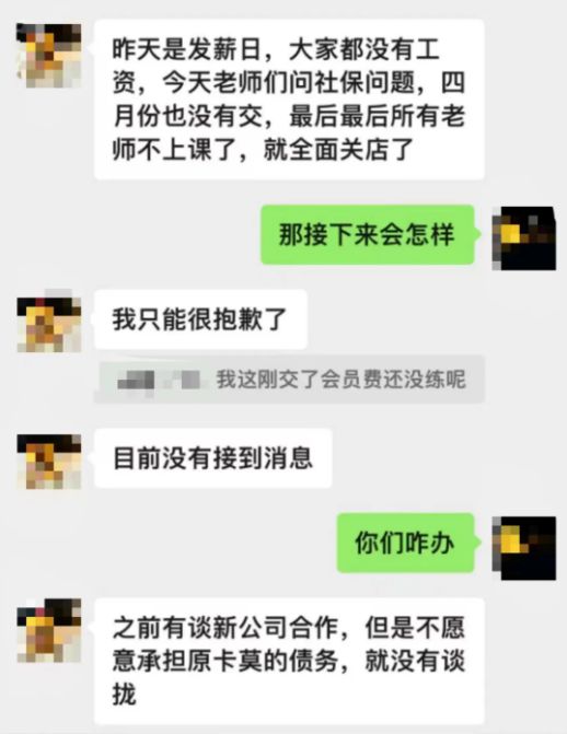 据中国商报报道,消费者王女士告诉记者,去年5月,她办了卡莫瑜伽金源店和能量城市店的通用年卡,目前卡内仍有1万元余额,剩余20多节私教课未用。5月21日晚,卡莫瑜伽的销售人员向她发来停业整顿的消息,表示“公司倒了”。
