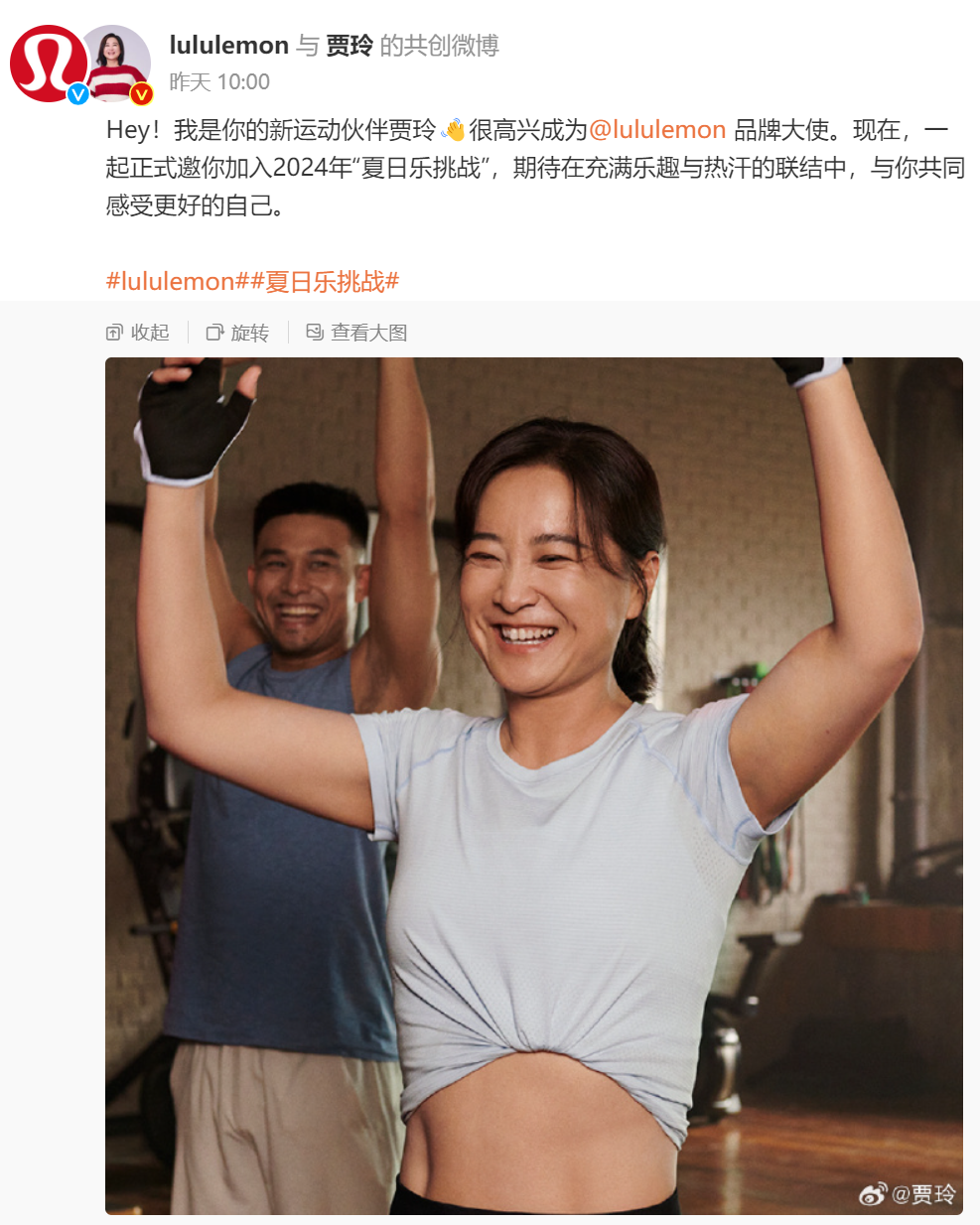 6月20日,知名瑜伽运动服装品牌lululemon宣布贾玲成为品牌大使。
