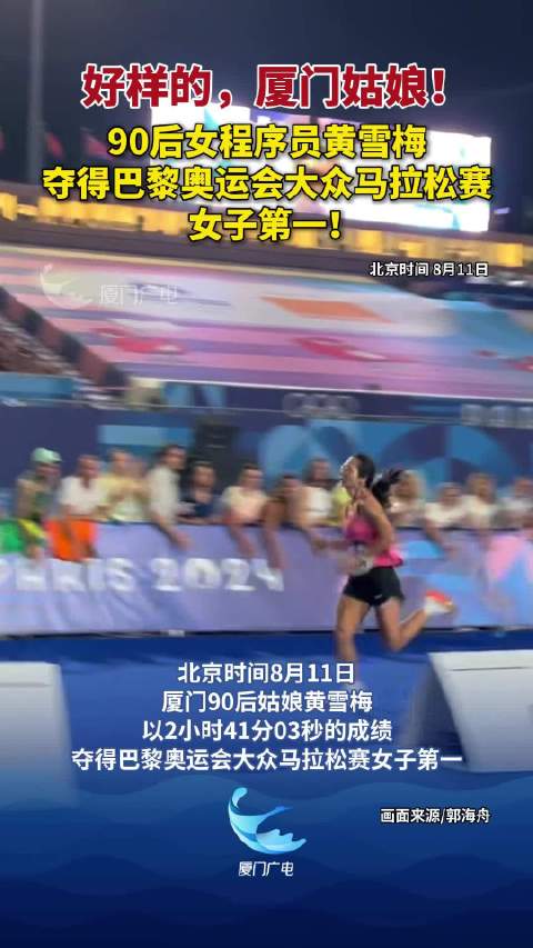 [#中国姑娘跑出奥运会大众马拉松第1#[666]]北京时间11日,巴黎奥运会大众马拉松赛结束。福建厦门的“90后”姑娘黄雪梅,以2小时41分03秒的成绩完赛,获得女子组第一名!黄雪梅是一名银行程序员,全职上班,兼职跑步。姑娘好样的!@厦门广电