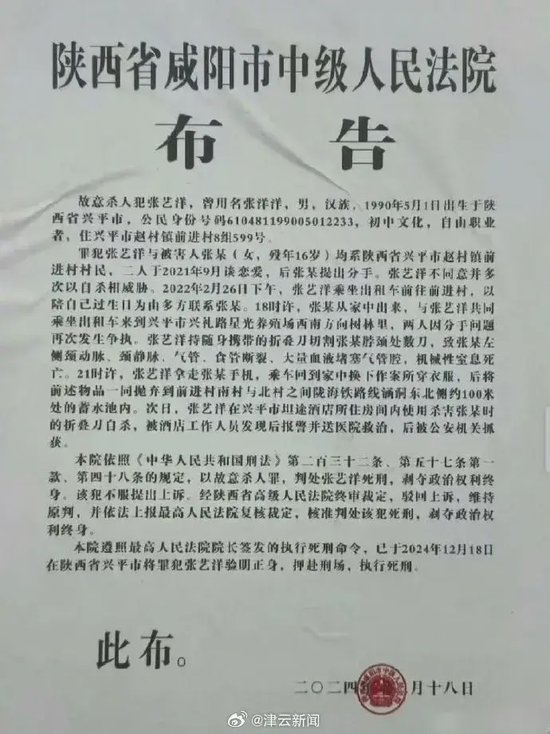 陕西咸阳市中级人民法院近日公布一宗曾轰动社会的杀人案调查报告,2022年时,男艺人张艺洋因不满16岁女友提出分手,持刀将其杀害,并试图制造女方自杀假象,最终以故意杀人罪被判处死刑,并已于去年12月18日遭枪决,他也因此成为中国娱乐圈首位被依法判处并执行死刑的艺人。
